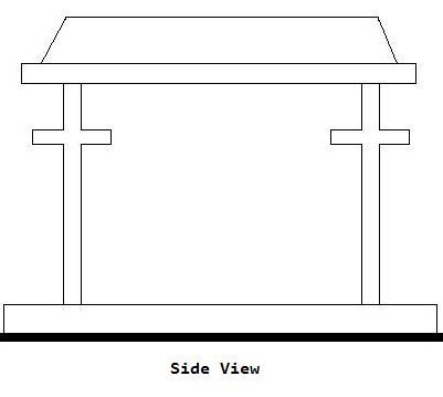 Here is Frank Lloyd Wright's second proposal for The Holiest Of All on The Kingdom Of God's New World. It is more along the lines of the original Holiest Of All, but instead of three twelve sided pillars holding it up, two gold crosses will hold it up on each side, and the open space shall again be filled with green emerald. The top shall be edged with granite and the roof itself, be gold, an elegant design.
