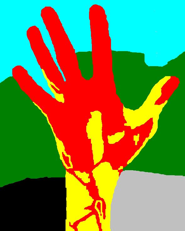 God has announced to the people of the world that He is personally directing the uprising against the illegitimate government in Iran that the people are now conducting. He commissioned Speaker Gerald Polley, an internationally known psychic, that is currently in His service, to do an art work symbolizing the struggle. God did not actually come through the Speaker and control his hands to do this art work, but He did guide him, saying "I'd like more blue over here, and a little bit more red here." The image was created using as few colors as possible. It symbolizes the blood of the government's innocent victims on the hands of the protestors who were aiding them. It shows what these false rulers will do to keep power, false believers. God is asking the Iranian protestors to make this their symbol, put it on plackets and carry it during the demonstrations.