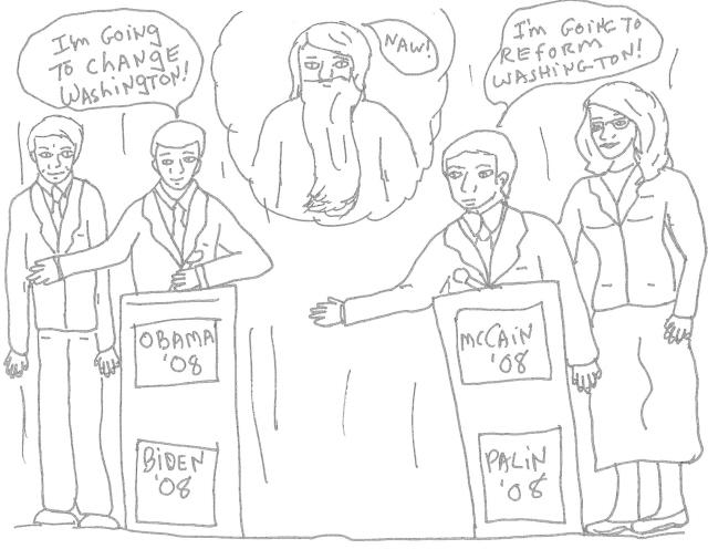On the left side of this picture are Senator Obama and Biden. Obama is saying "I will change Washington!" On the right side are Senator McCain and Palin. McCain is saying "I will reform Washington!" God is looking at them from Heaven and saying "Naw!"