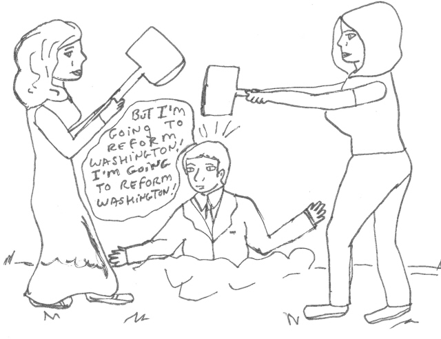 Senator McCain is being pounded into the ground by two women with huge mallets. He is saying "But I'm going to reform Washington! I'm going to reform Washington!"