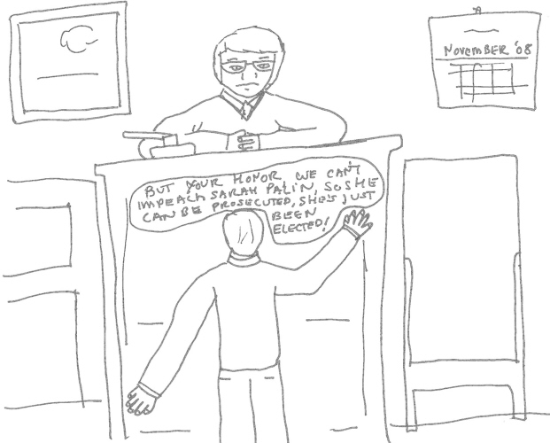 A man is standing in front of a judge who is sitting at hs bench. There is a calendar behind the judge on the wall reading November, '08. The man is saying to the judge "But your honor, we can't impeach Sarah Palin so she can be prosecuted, she's just been elected!"