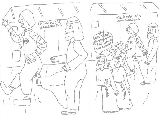 Ronald McDonald is in front of a McDonald's Restaurant in Iraq being kicked in the ass by the spirit of Muhammed. In the second panel there are two guys Muslim guys standing in front of Ronald and Muhammed. One of the guys says "Well, I see Muhammed has joined the boycott" The other guy says "Yeah, let's go to Wendy's!"