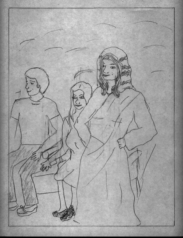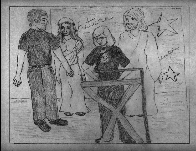 Got back to the hotel and rested a little. Tara came over with a keyboard that the show had purchased especially for Linda to use. It took us a while to figure out what music to use and how to set the thing. Fortunately Tara was a little bit smarter than we were, and figured out how to keep the settings when you turned it off. We practiced and practiced! Fortunately there wasn't anybody in the adjoining rooms. At 4 p.m. we were taken to the studio for rehearsal. What an adventure! But it was a lot of fun. Everybody was so helpful and so kind! We got the song down pretty good, went back to the hotel, rested a little, and went back to the studio about 7. We had a nice little dressing room downstairs, right across from the make up room so we could see the people coming and going. Gerald's legs were really bothering him. The staff got us a meal from the restaurant next door. Absolutely incredible burgers! We rested and finally they came down and took us up back stage. We could see and hear on monitors what was going on on the stage. They were showing a skit about the star of a new Jesus movie and it was pretty funny. We thought Jesus would be upset but He thought it was hilarious and just exactly what we needed! This was no coincidence. We went out on the stage, were greeted by Jimmy. We gave Jimmy a copy of George Harrison's book, "Wow!" on a floppy disc. He asked us why we didn't have a paper version yet and we explained we were working on a publisher. Jimmy showed some pictures Linda had drawn of what had been happening with John Lennon in The Afterlife, and we talked about them. They did a commercial break, then we got up and sang. You can't imagine what it is like for someone like Gerald with dyslepsia to try to do anything in all that noise and confusion! But we did quite well. Came back talked for a few minutes, then the show was over. Everybody said what a wonderful job we had done. We headed back to the hotel, got a good night's sleep and took the plane home in the morning. What an adventure! But of course the audience couldn't see everything that was going on! While we were on the stage Mary Magdalene and Jesus were with us. While we were talking with Jimmy Jesus was standing with his hand on Jimmy's shoulder. There was one lady in the audience that was a little exposed and Mary Magdalene positioned herself between Gerald and her so Gerald wouldn't be distracted. See the pictures below.