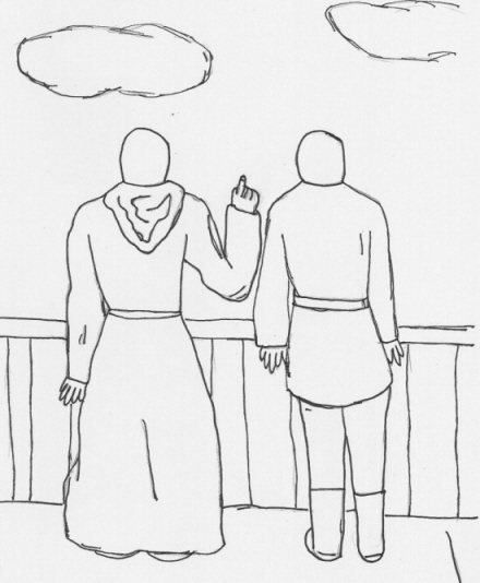 The Dove pointing out his lady of choice to Swift Deer on the balcony.